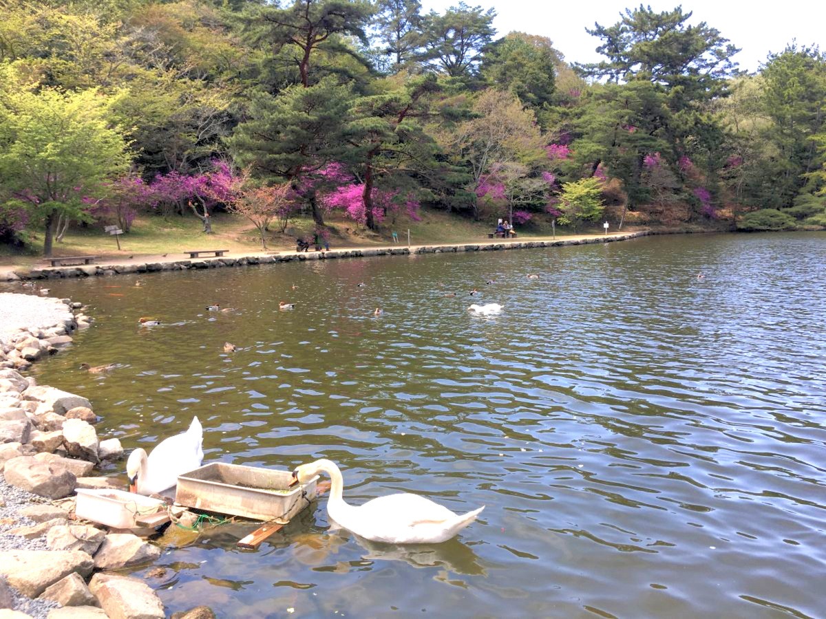 カモが飛来する赤松池の周辺でも、ドッグランでも色彩豊かなツツジ景色が楽しめます!花や樹々。白鳥さんたちとも一緒に、太陽の光をたっぷり浴びましょう。晴れを好む花・スーイトピーの産地でもある玉野市で、のんびりぽかぽか春の一日を。