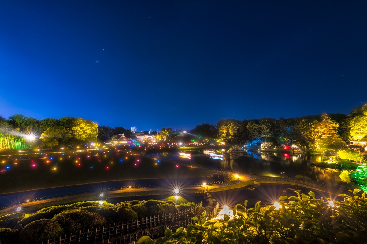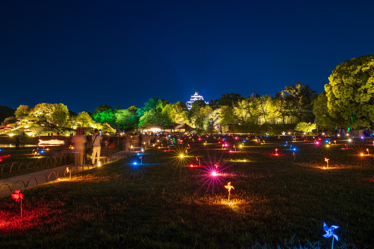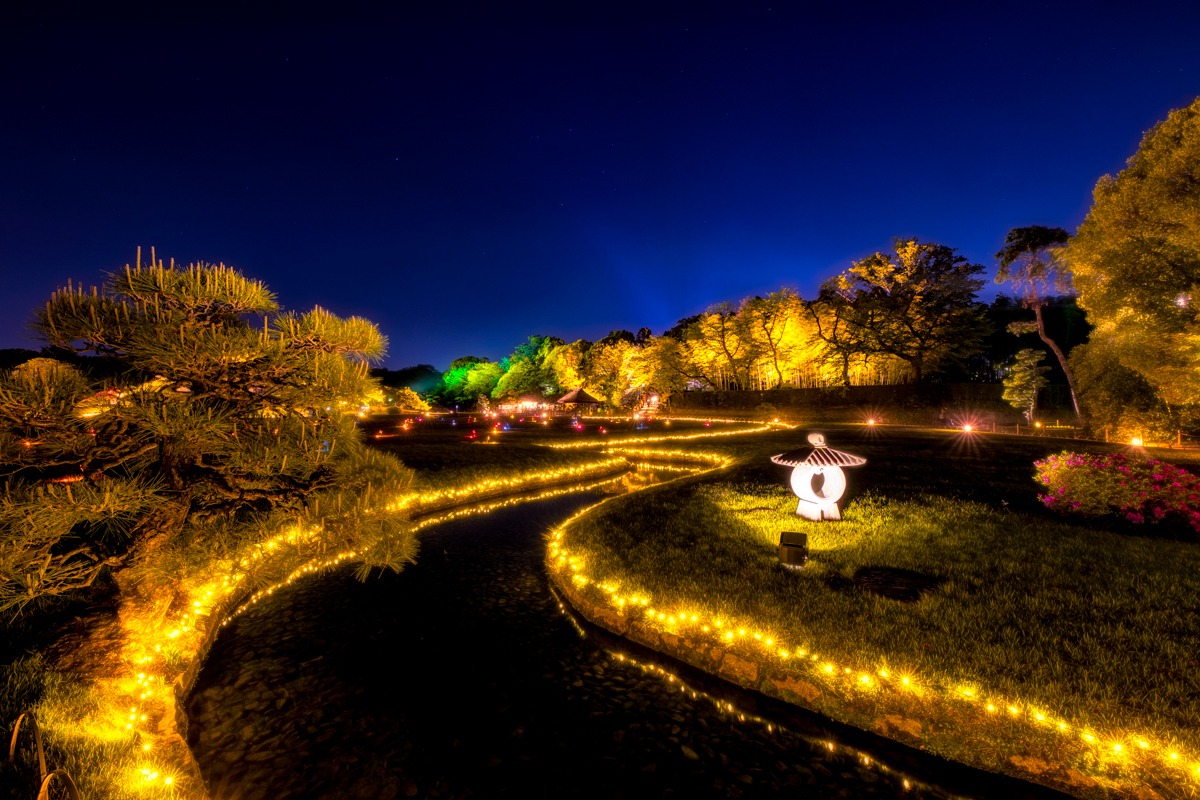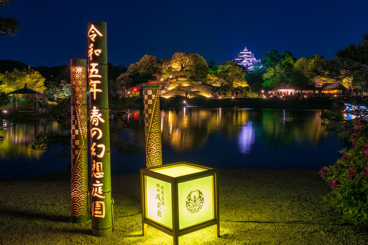 岡山後楽園「春の幻想庭園」・岡山城「春の烏城灯源郷」のライトアップが幻想的!