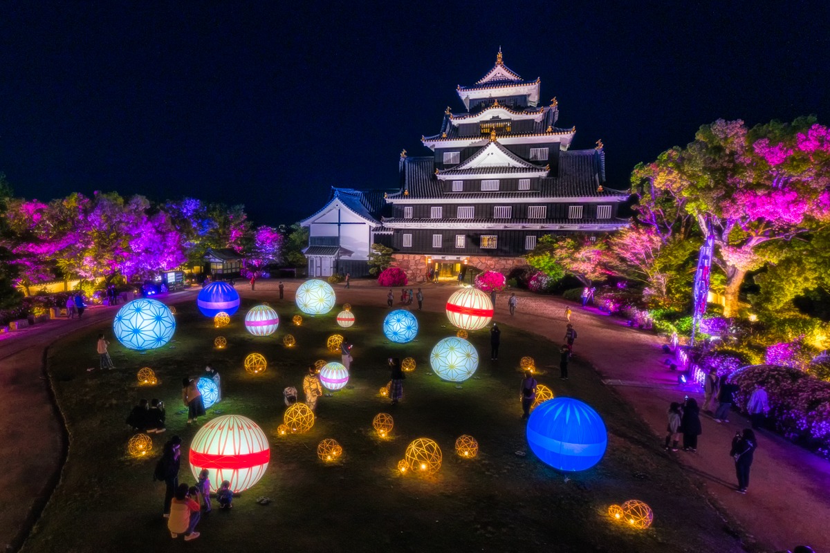 大小様々な毬のオブジェがカラフルに天守閣前広場に飾られ、岡山城を幻想的に彩っています。