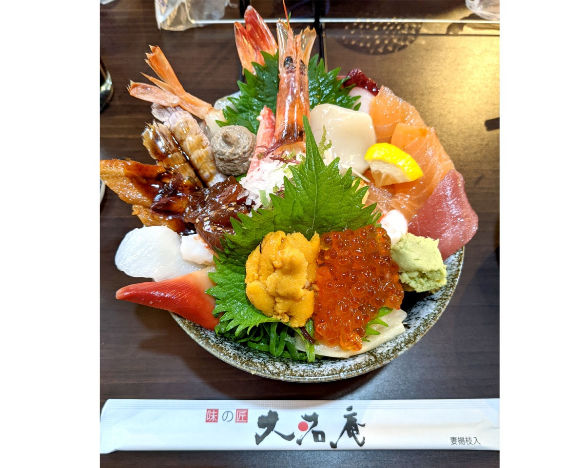 岡山中央卸売市場の「市場ふくふく通り」にある海鮮丼の専門店。器から海鮮がこぼれんばかりに盛られた丼メニューは圧巻です。店内での飲食だけでなく、テイクアウトも可能です。