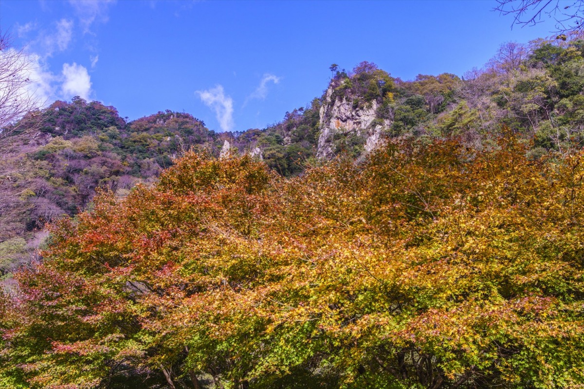 高梁川の支流・槇谷川が花崗岩の大地を削って作り上げた奇岩絶壁と、色あざやかな紅葉が調和する壮大な自然美が訪れる人たちを驚かせます。