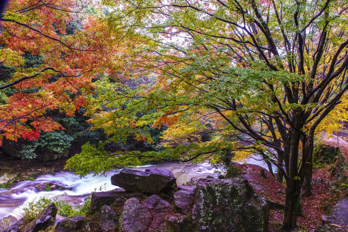 宇甘川の川幅が極度に狭くなり、奇岩がそそり立つ山肌を赤や黄色の樹々が飾ります。シンボルである「赤橋」から見る景色も美しいと評判です。