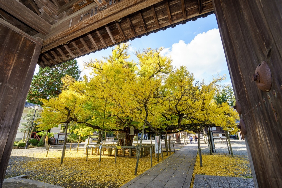浄土宗知恩院派の寺院で、法然上人が幼年時代に修行した寺として知られています。境内の大イチョウは高さ約45m、目通り周囲約12m、推定樹齢900年を超える県下一の大樹で、天然記念物に指定されています。