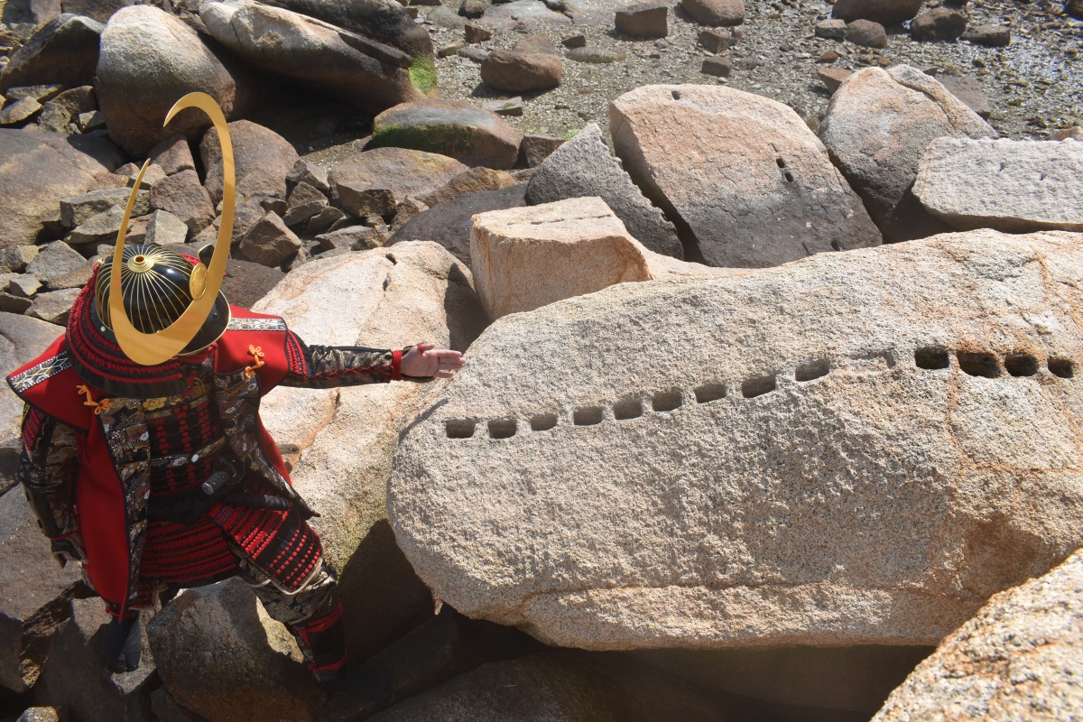 次は矢穴痕の残る丁場へ来てみた。矢穴というのは石を切り出したときの作業痕なんじゃが、まず石を割るにはノミと槌で石に長方形の穴を割る方向に一列に空けていく。そのできた穴に楔を打ち込み、少しずつ叩いて割っていくんじゃな。割れたあとには穴の半分が残るということなんじゃ。それを矢穴と呼んでおるんじゃ。
