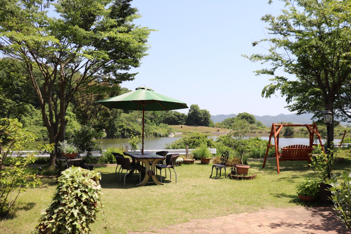 店内からテラスに出ると、外の風も気持ちよく、小鳥のさえずりしか聞こえないので、幹線道路が近いのに別世界に来たようです。湖畔を眺めながら、新緑の木陰でブランコに乗ってみたくなります。