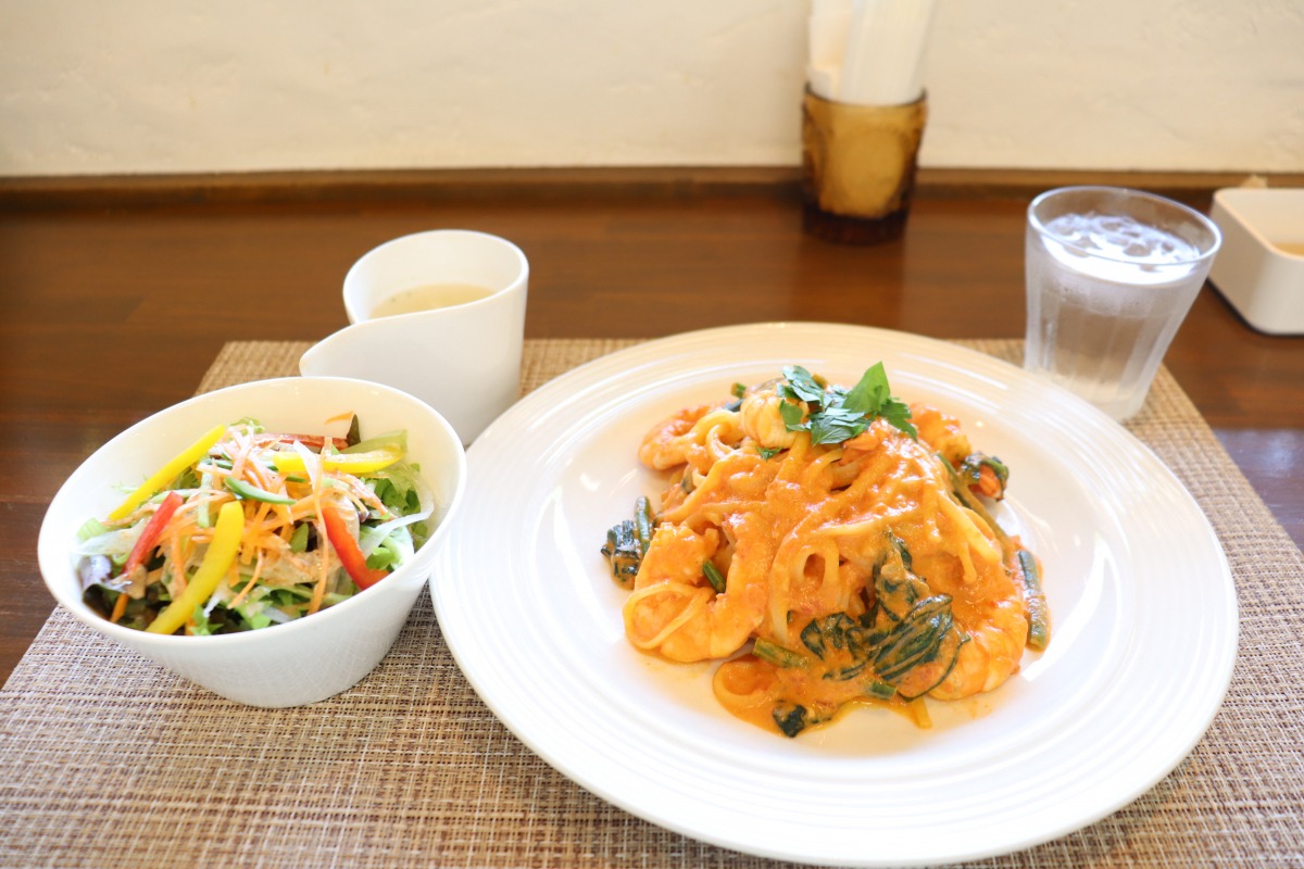 私は、えびのトマトクリームパスタにしてみました。ぷりぷりのえびが入っていてボリューム満点でした。新緑のお庭を眺めながらいただける、カウンター席で頂きました。