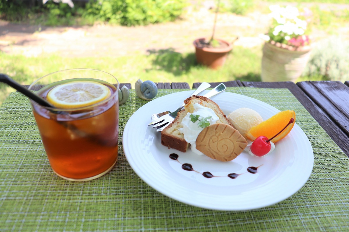 チョコシフォン、金柑のパウンドケーキ、チーズケーキの3種類から選べたので、金柑のパウンドケーキにしてみました。あまりに外が気持ち良さそうなので、デザートは、テラス席で頂きました。目の前に湖畔、鳥のさえずりがバックミュージックという最高のロケーションです。ケーキも美味しかったです。