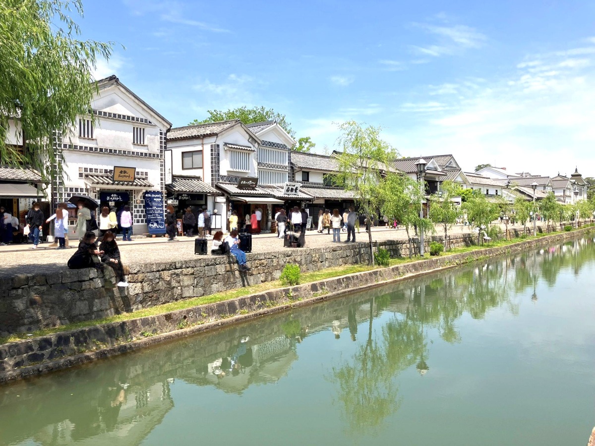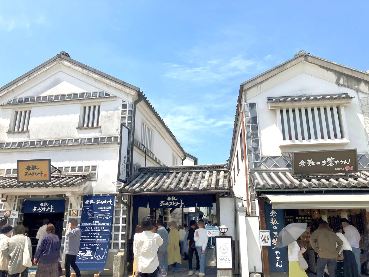 なまこ壁の町並みに良く映える、デニム色のグルメを傍らに。倉敷川沿いの石垣に腰かけながら。ゆったりと川舟めぐりを眺めながら。岡山屈指の人気観光地・美観地区を思う存分たのしんでいってくださいね!