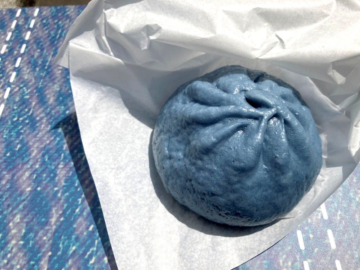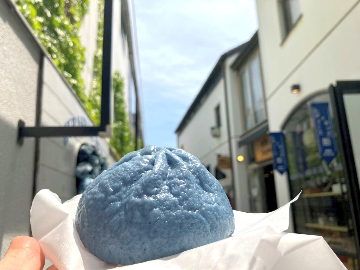 上から見ても横から見ても、やはり青。これはまさか幸せの青い肉まん!?倉敷ならではの非日常ご当地グルメ、食さない手はありません。黒豚を使用した肉あんは甘くてしっとり。手軽に食べられるので、年代を問わずみんなで楽しめます。