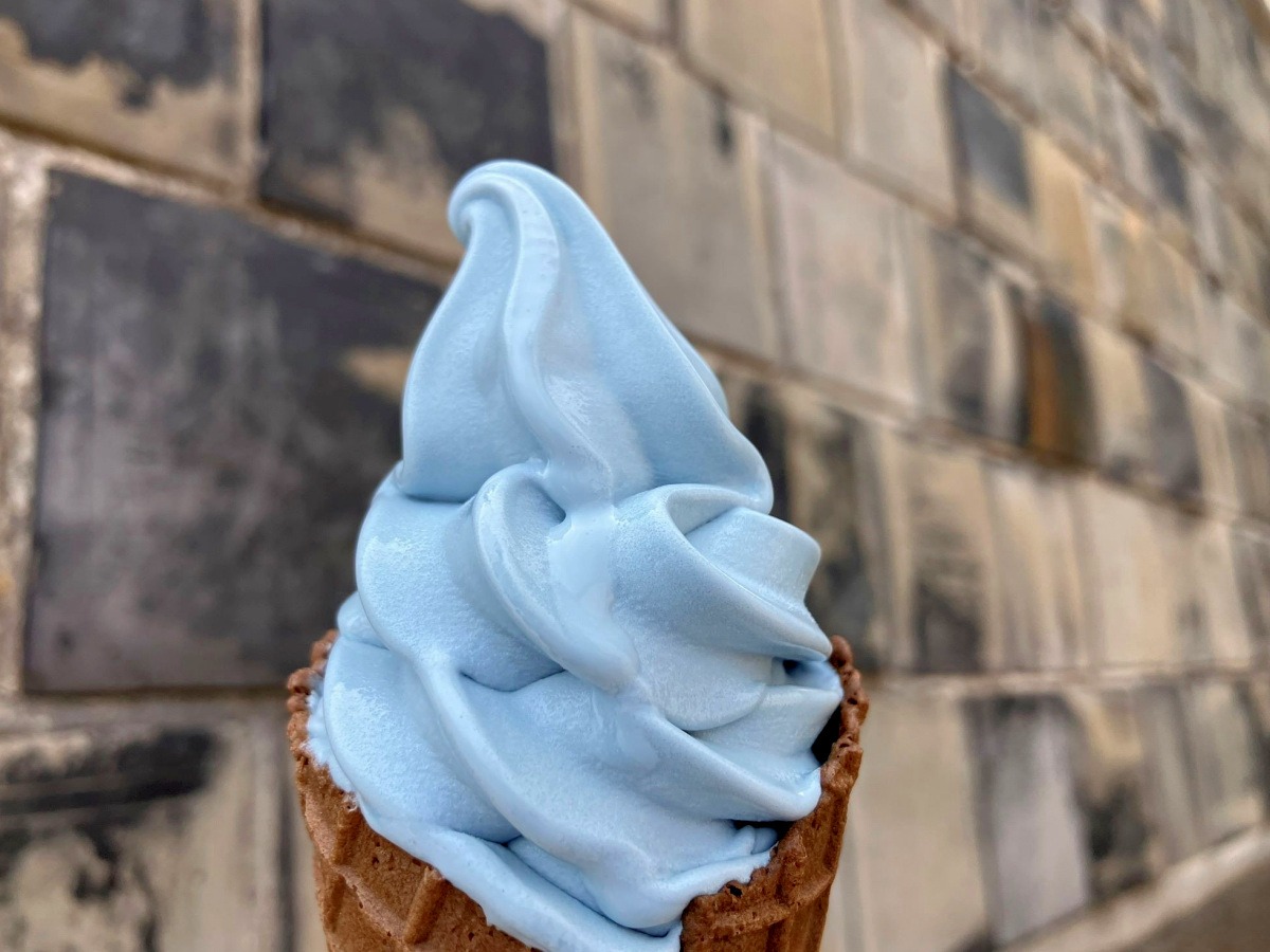 ソフトクリームもほんのりデニム色に染まっています!爽やかなラムネ味が口に広がって、ほっとするような味わい。隠し味にはなんとブルーベリーが入っているそうです。しっかり固めのコーンとも相性抜群。