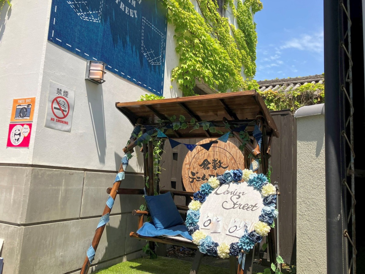 美味しいデニムグルメを堪能した後は、通りのあちこちにあるフォトスポットを探してみるのも楽しいですよ。一番奥には、デニムのデコレーションが施されたカワイイ木製ベンチ。みなさん代わる代わる座って撮影されていました。