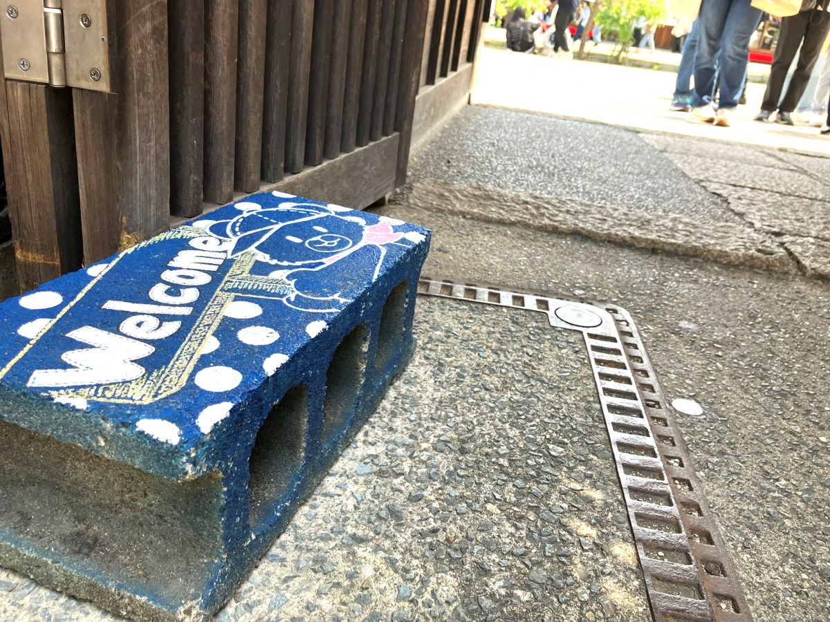 木戸のドアストッパー代わりのブロックまで、デニムで統一されていました!可愛いデニムベアーがお出迎え。他にもショップの入り口のマットなどまでデニムデザインになっているので、足元まで気が抜けません。