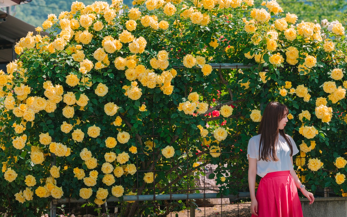 こちらも黄色のバラの壁となっていて、背景全面がバラの写真が撮れます。