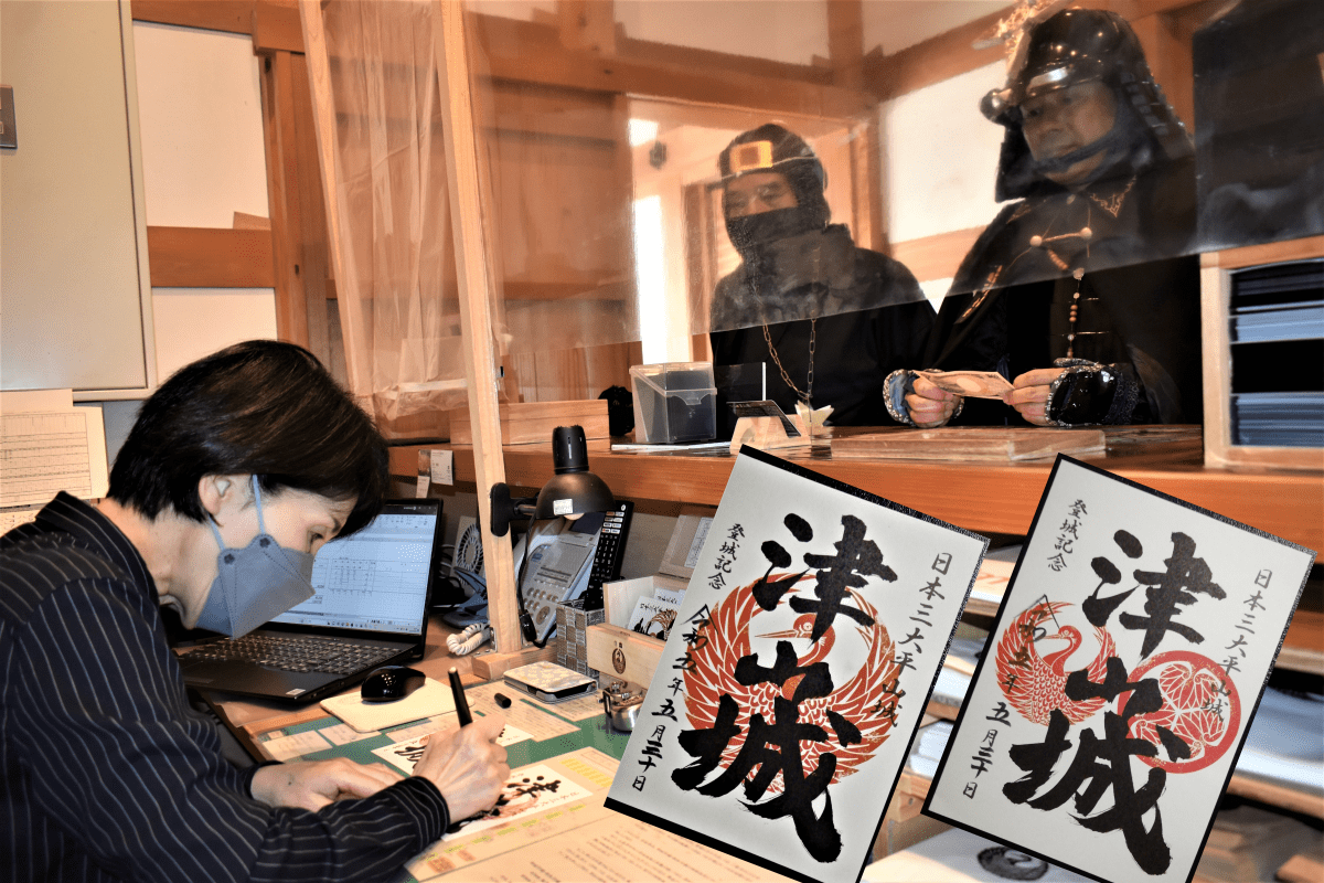 森氏の家紋「鶴丸」と森氏の後に津山藩主となった松平氏の家紋「三葉葵」の2つが並んだデザインの二種類がある。希望者には登城した日付を記入してもらえるのは嬉しいかぎりじゃ。