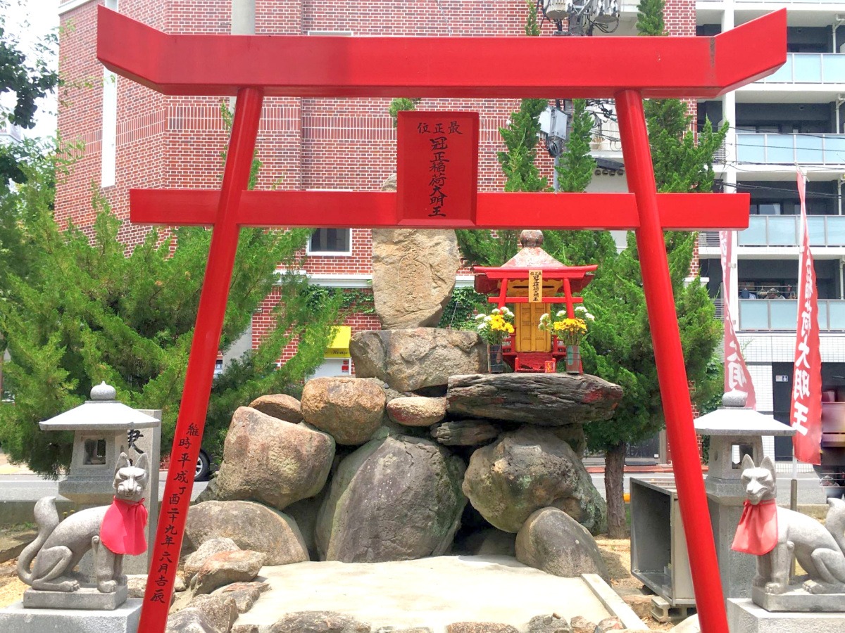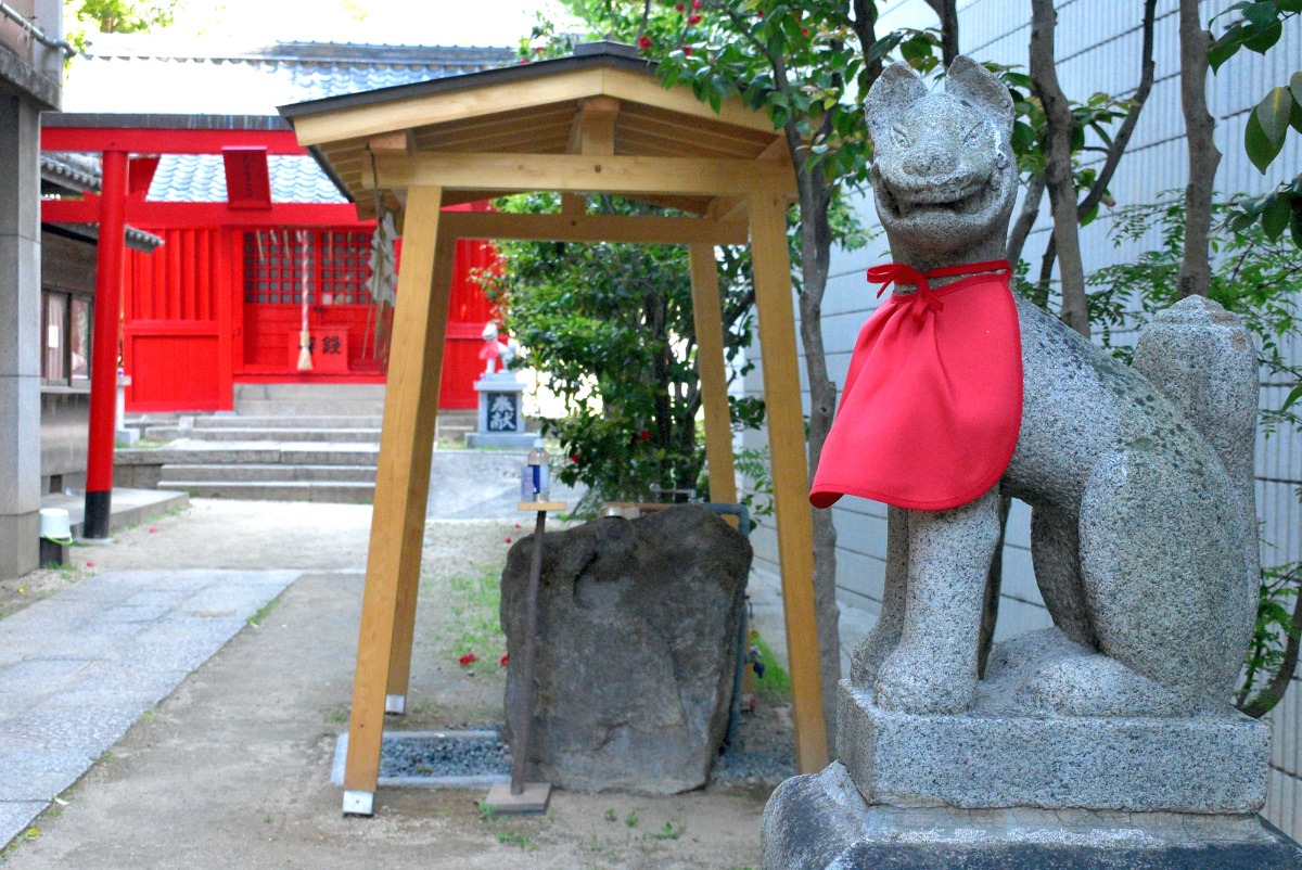 江戸時代からつづく商売の町・奉還町のビル街の片隅。ひょっこり現れた赤い幟の中に、ほっこり空間が広がっています。鮮やかな花や置物。フレンドリーな佇まい。五穀を司り、火も自在に制御するとされる稲荷神。飲食店の多い界隈ならではの地域密着型お稲荷さんです。
