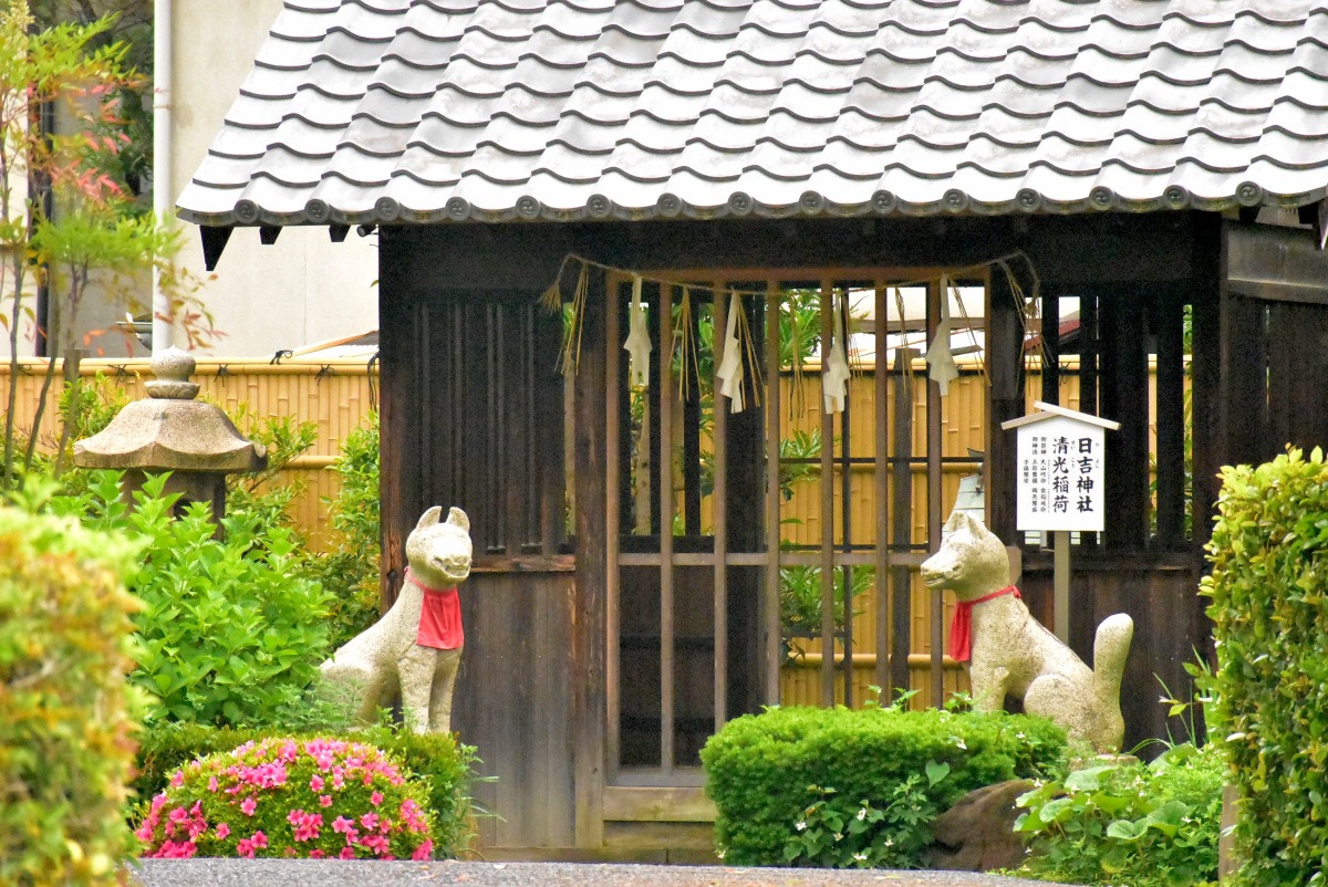 比叡山一帯の地の神を氏神様とする山王信仰(日吉神社)と、稲荷信仰が1つになったフシギな祠を、巻物をくわえたお狐さんが守っています。今からでも知恵が授かりますように。本殿ウラには技能・芸能の神を司るとされる伏見稲荷もあり。歴代城主ともゆかりの深い神社です。