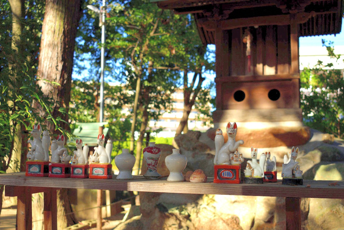 「おやおやどこか悪いのかい?」と、かわいい陶製のお狐さんたちが耳をたてて願い事を聞いてくれています。すぐ横には「ぼやきの井戸」(水神様)もあるので、色々つぶやいてスッキリ家に帰れそうです。