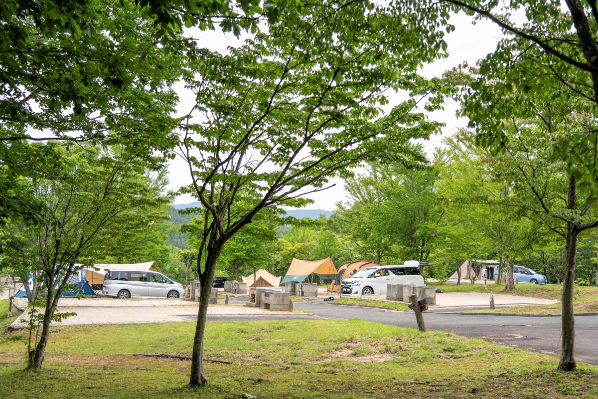 車の乗り入れができるオートサイトは全部で54区画。管理棟にも近い拓けたエリア、傾斜地に位置するエリア、緑の木々に囲まれたエリアなど、雰囲気の異なる場所にサイトが点在しています。