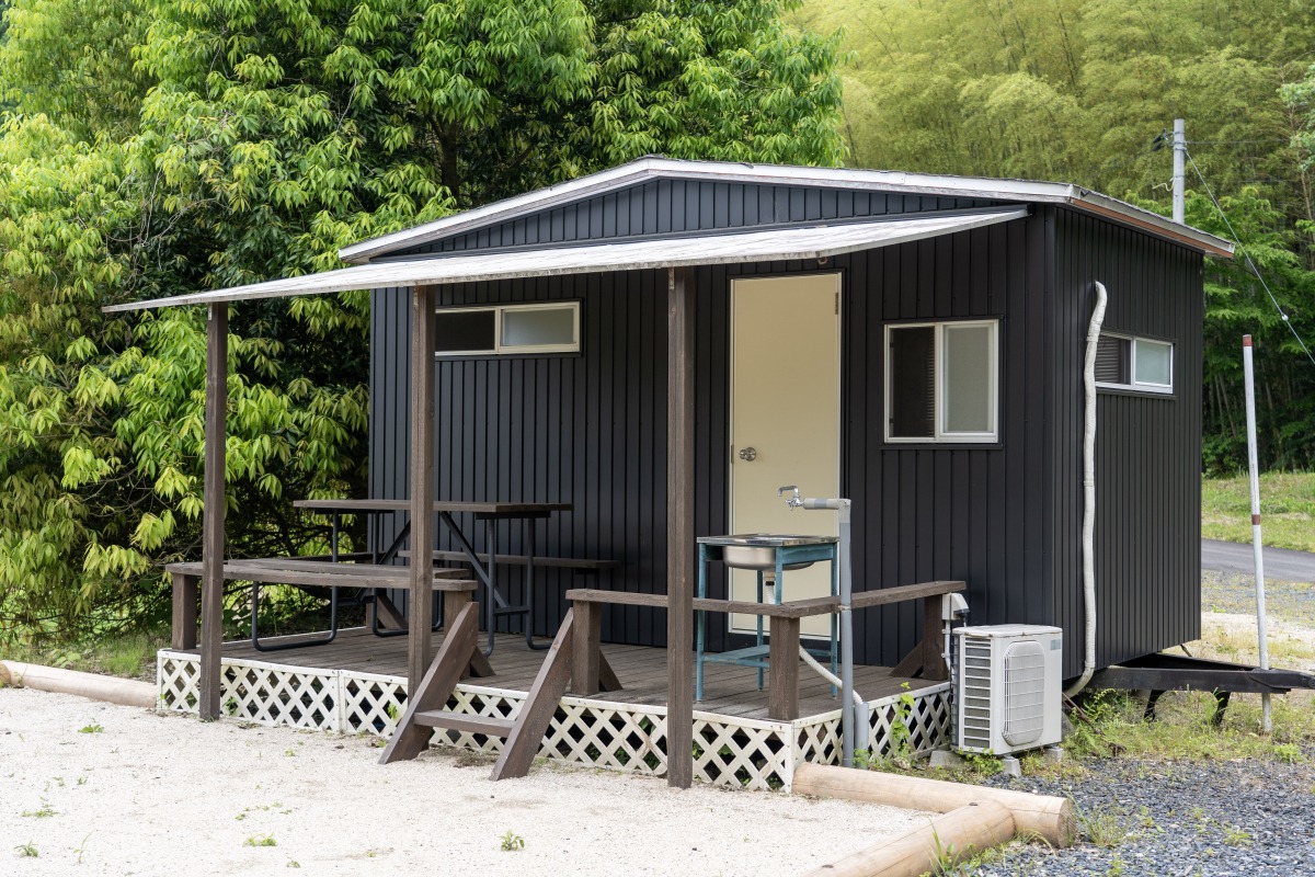 ウッドデッキ付きのトレーラーキャビンは全3棟。キャビンの前にはテントサイトも併設されているので、テントキャンプを楽しみながら、小さい子どもや女性はキャビン内で宿泊、という使い方もできます。
