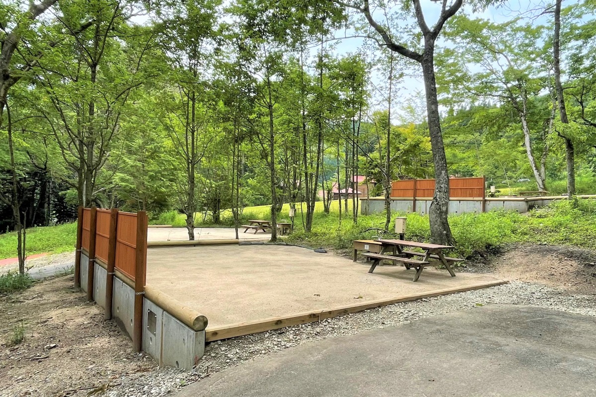 リニューアルで水はけも良くなったオートキャンプサイトは全14区画。各サイトにAC電源と給水設備完備。木立や柵でプライバシーにも配慮されています。