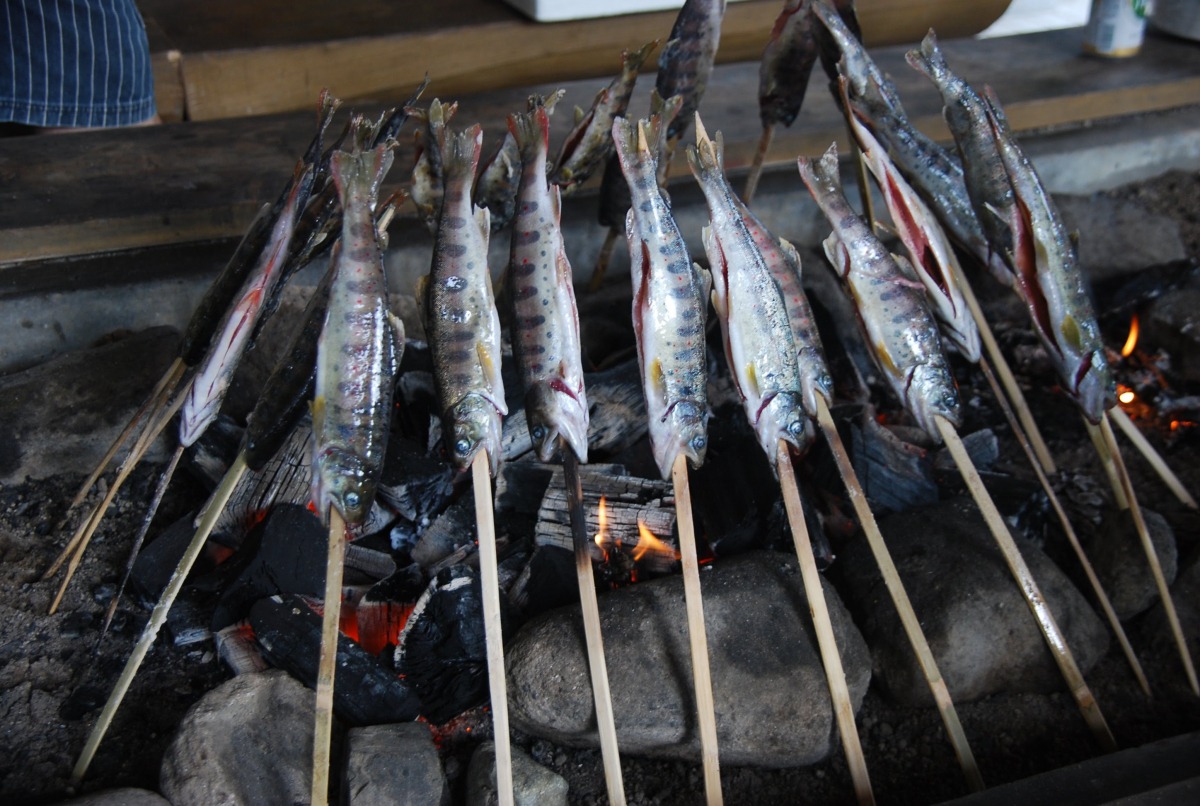 キャンプ場内の川ではひらめ(アマゴ)のつかみ取りも楽しめます。獲ったひらめはスタッフの方が内臓を処理して串に刺してくれるので、炭火で塩焼きに!
