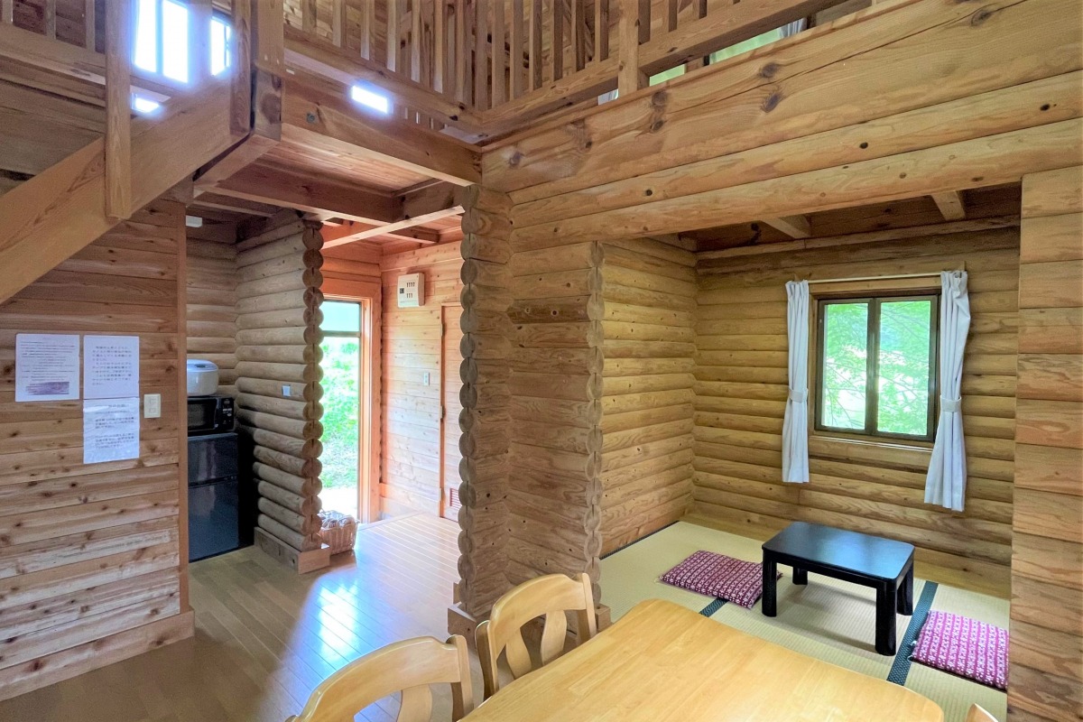 コテージは、全棟トイレ・シャワー付き。吹き抜けのリビングルーム、リニューアルして広くなった2階の寝室、キッチンには冷蔵庫や電子レンジ、食器も揃っています。1階に畳敷きの寝室がある棟も。