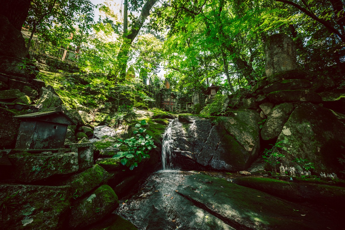 自然の木々に囲まれ、幾か所から清い水が湧き出、石段をのぼると沢山のお社やお稲荷さん。