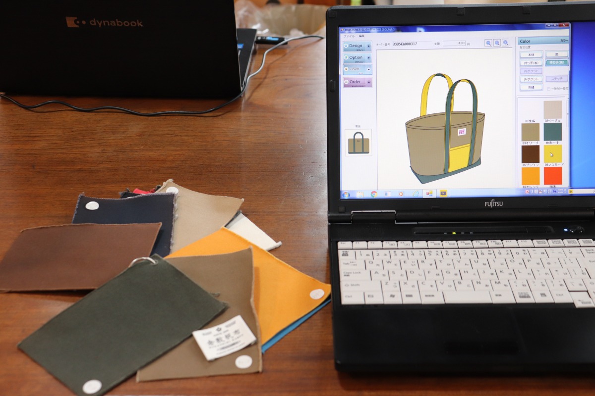 昔、綿花の栽培が盛んで、日本の繊維産業を牽引してきた児島エリア近くにあり、工場併設のショップには、色とりどり、バリエーションも様々なおしゃれなバッグや小物がたくさん並んでいました。イメージを固めながら、さっそくオーダーしてみました。