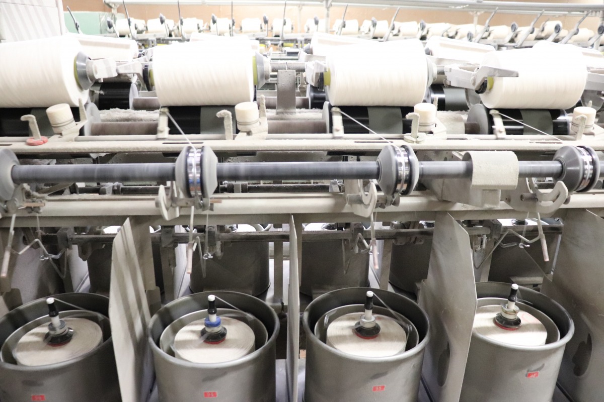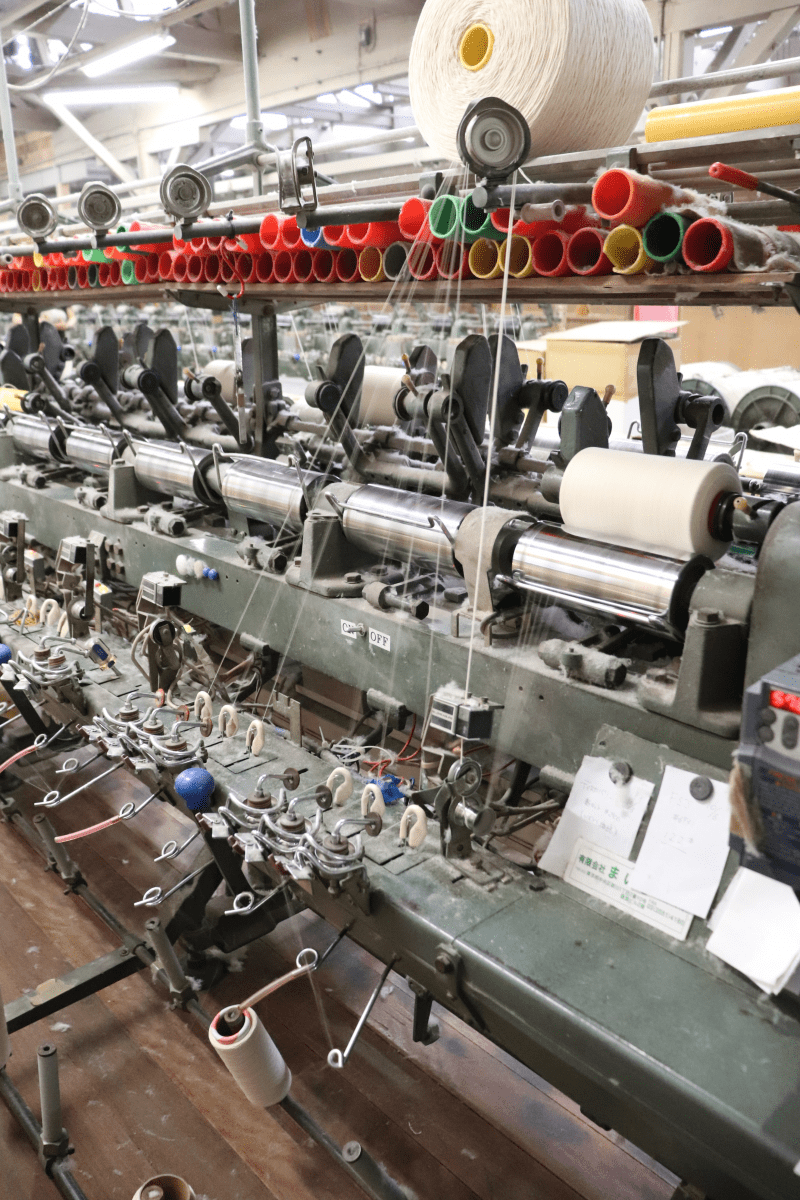 機械の上にある、通称「チーズ」と呼ばれる、紡績上がりの綿100%の原糸を巻いたロールから、2~8本の原糸を1本の糸に合わせていく工程、「合糸(ごうし)」。