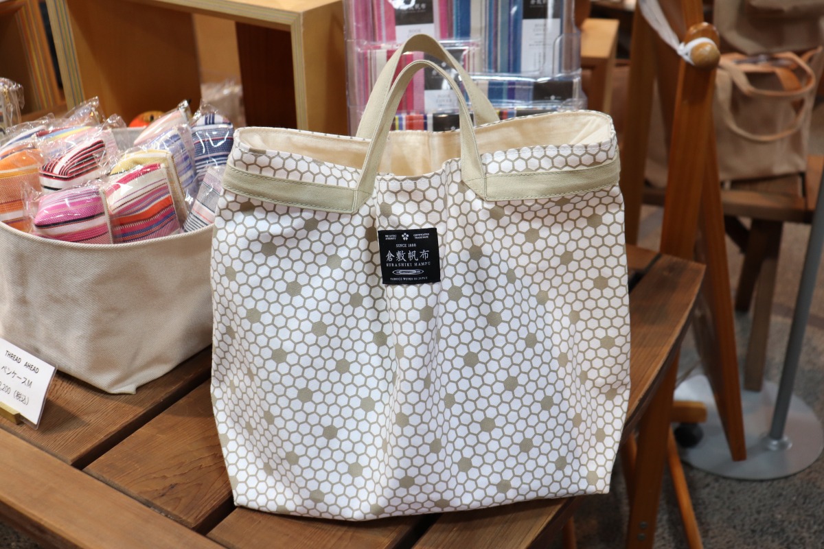 帆布生地の中でひときわ目を引いたバッグ、実は、トートバッグなどの内袋でした。蜂の巣を思わせるオシャレなデザインで、そのままでも十分使えそうで、ダブル持ちしてもオシャレです。帆布小物も充実のラインナップで、見ていて楽しくなりました。ストライプの小物は、糸を染めてから織った帆布で作られたものです。