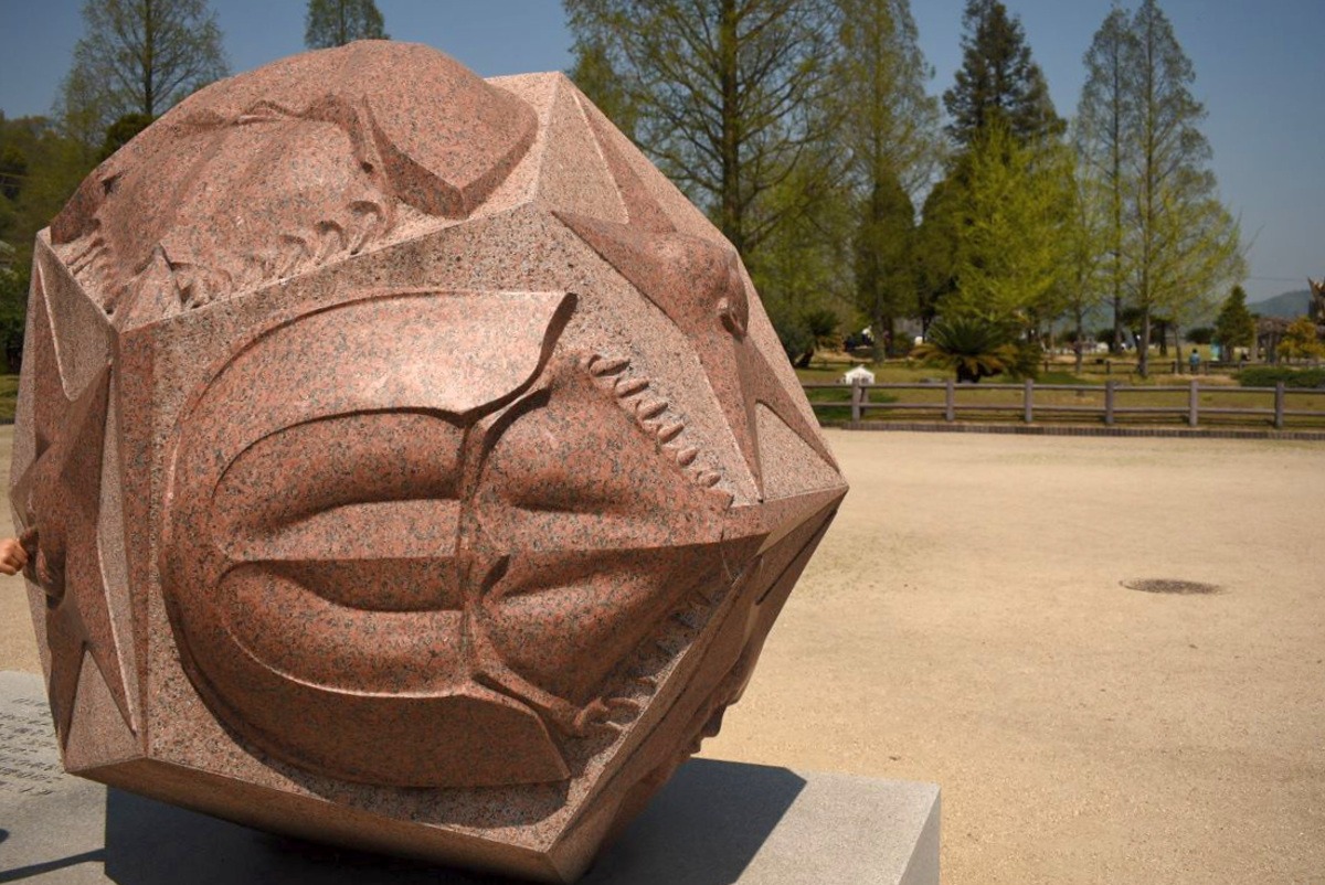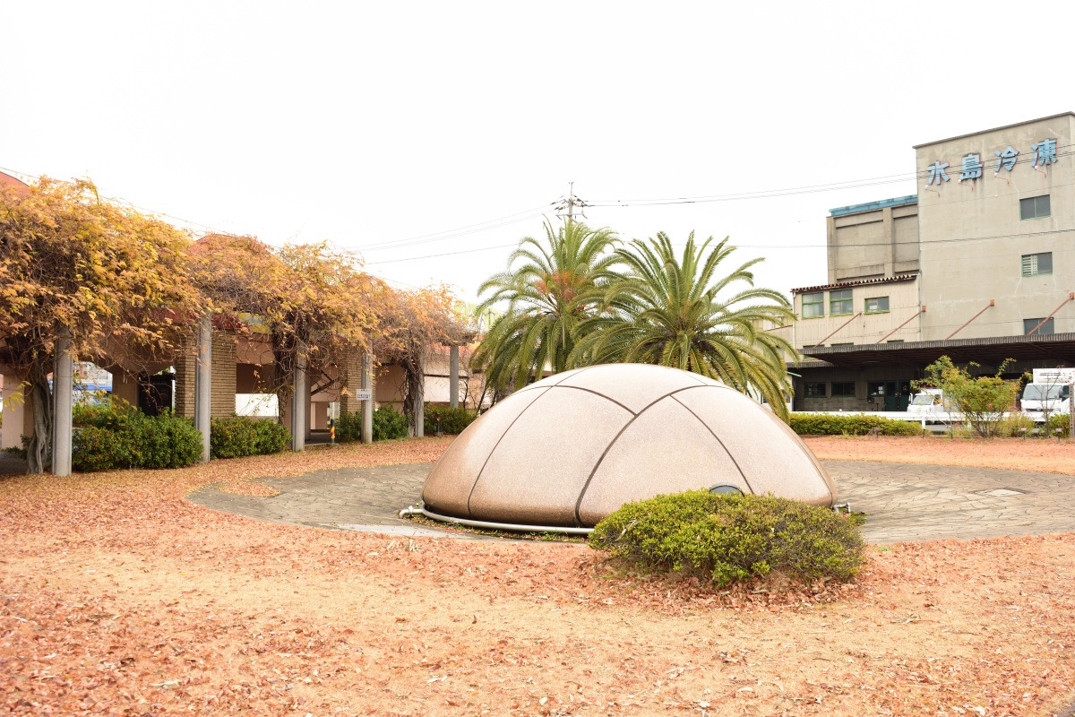 リアルなカブトガニが正12面体に張り付いている、実におもしろい幾何学的なモニュメントです。ヨーロッパで多く発掘されている、中が空洞になった中空12面体の鋳物の謎。約2億年もの間形を変えることなく生き続けて来た、笠岡を繁殖地とするカブトガニの謎。もはや宇宙レベルの謎たちがタッグを組んで、皆さまをお出迎えしてくれています。