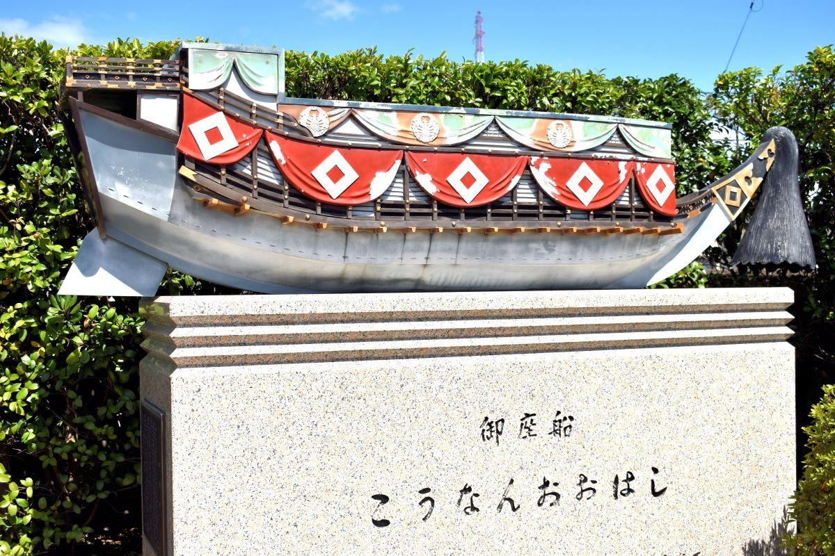 さあ、おかやまマラソン最大の難所、岡南大橋へやってまいりました。息を切らして登る橋の途中には給水ポイントでしょうか?いや、船です!なんと屋形船が現れました!参勤交代などの際には備前藩主も乗ったとされる、豪華賢覧な御座船(ござぶね)が鎮座しています。津田永忠像とともに、旭川沿いの見どころの1つと言えるでしょう。