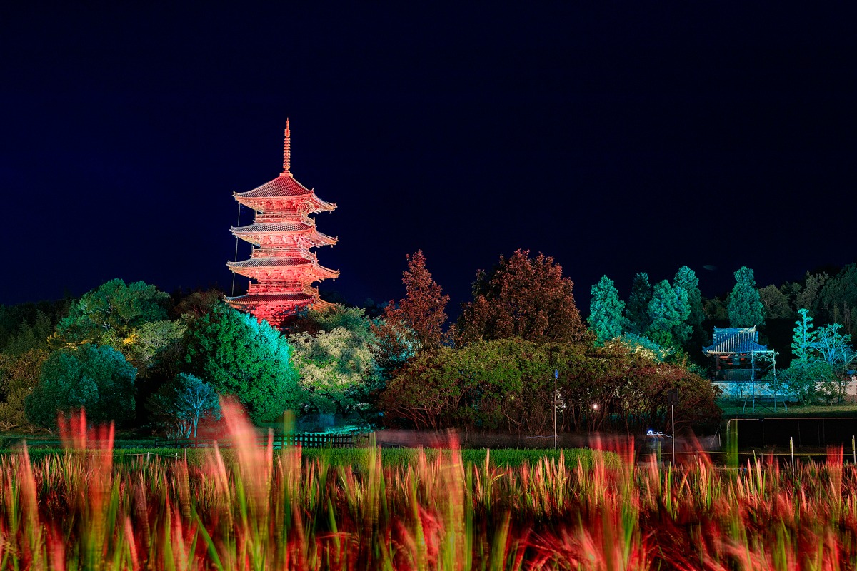 岡山県唯一の五重塔とひまわりという組み合わせ。