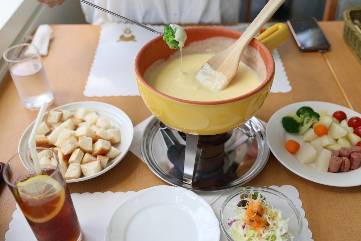蒜山のジャージー牛から作られるチーズフォンデュは、チーズが美味しいので、野菜もパンもさらにおいしく感じました。熱々のチーズフォンデュを蒜山の自然をバックに頂けて最高でした!