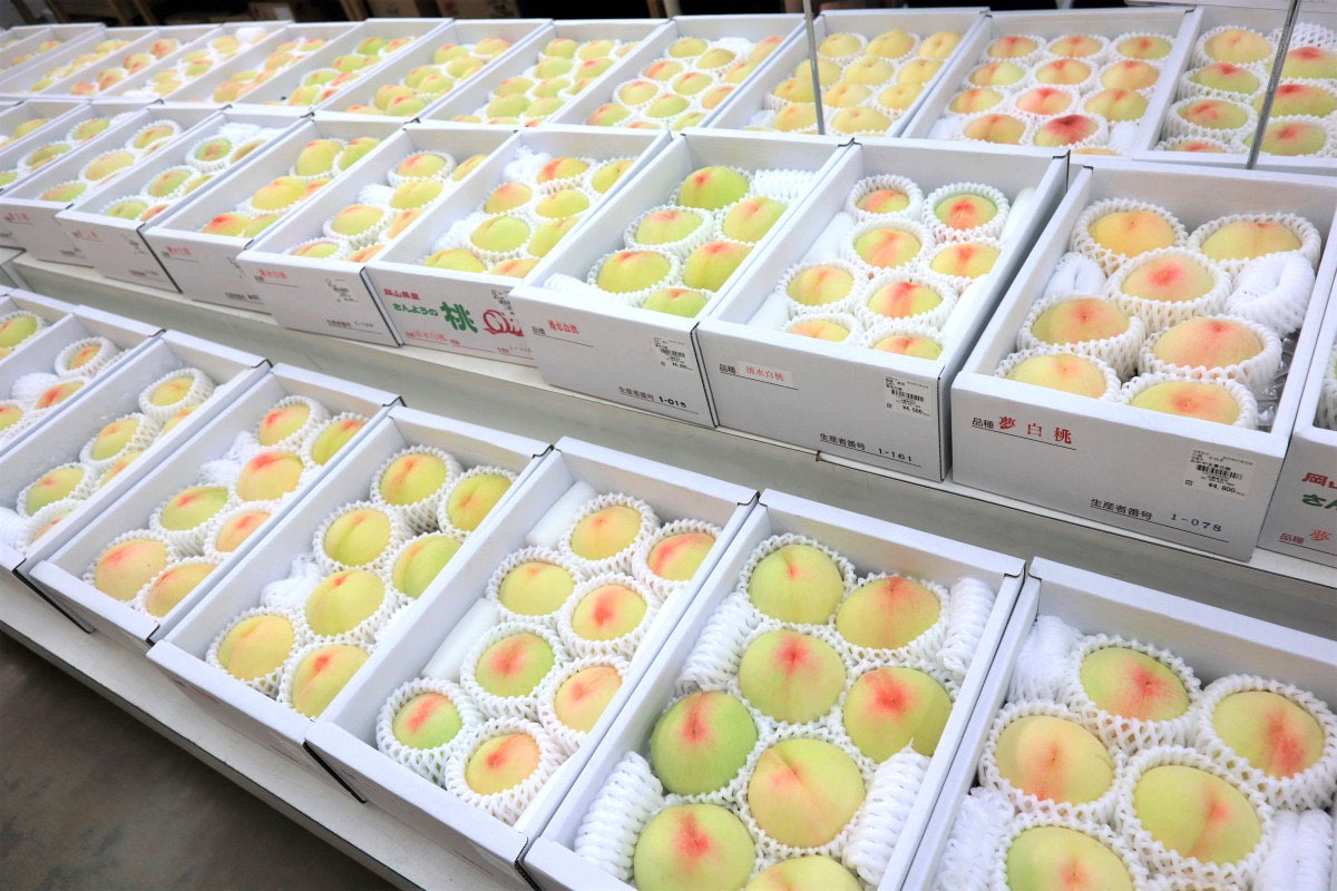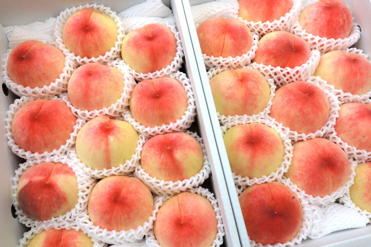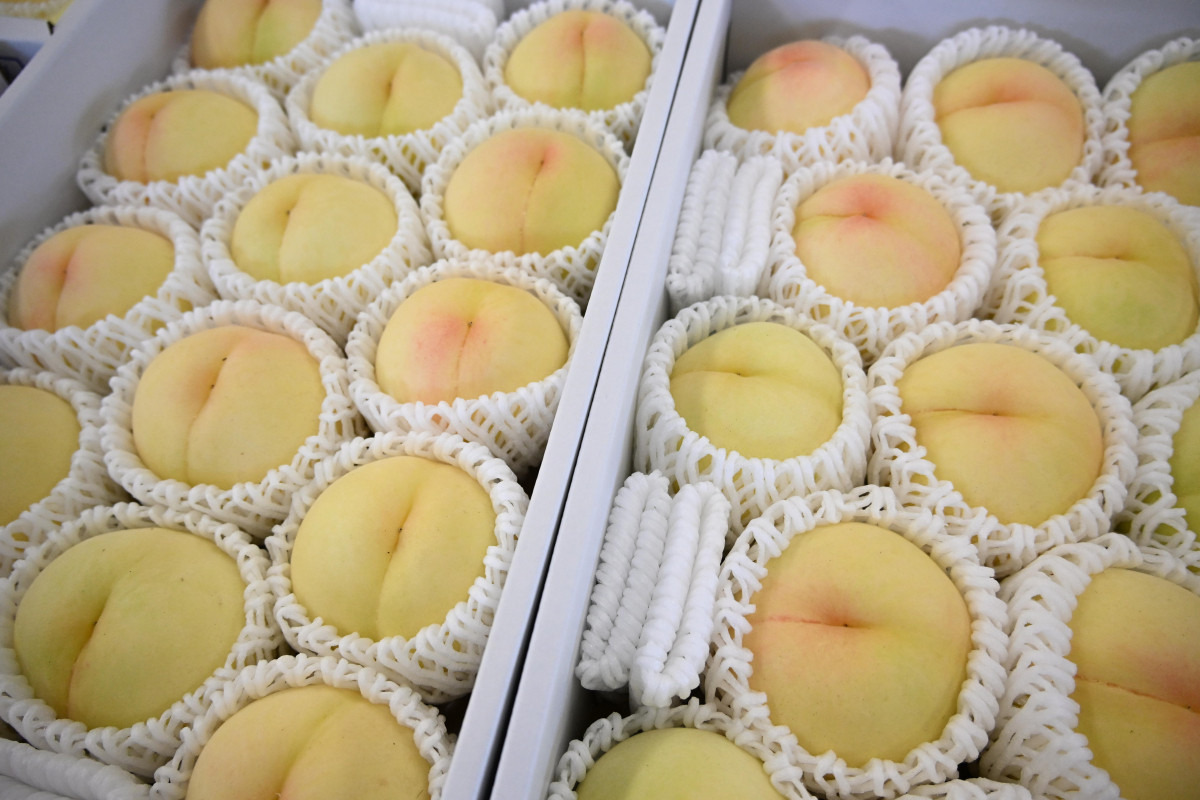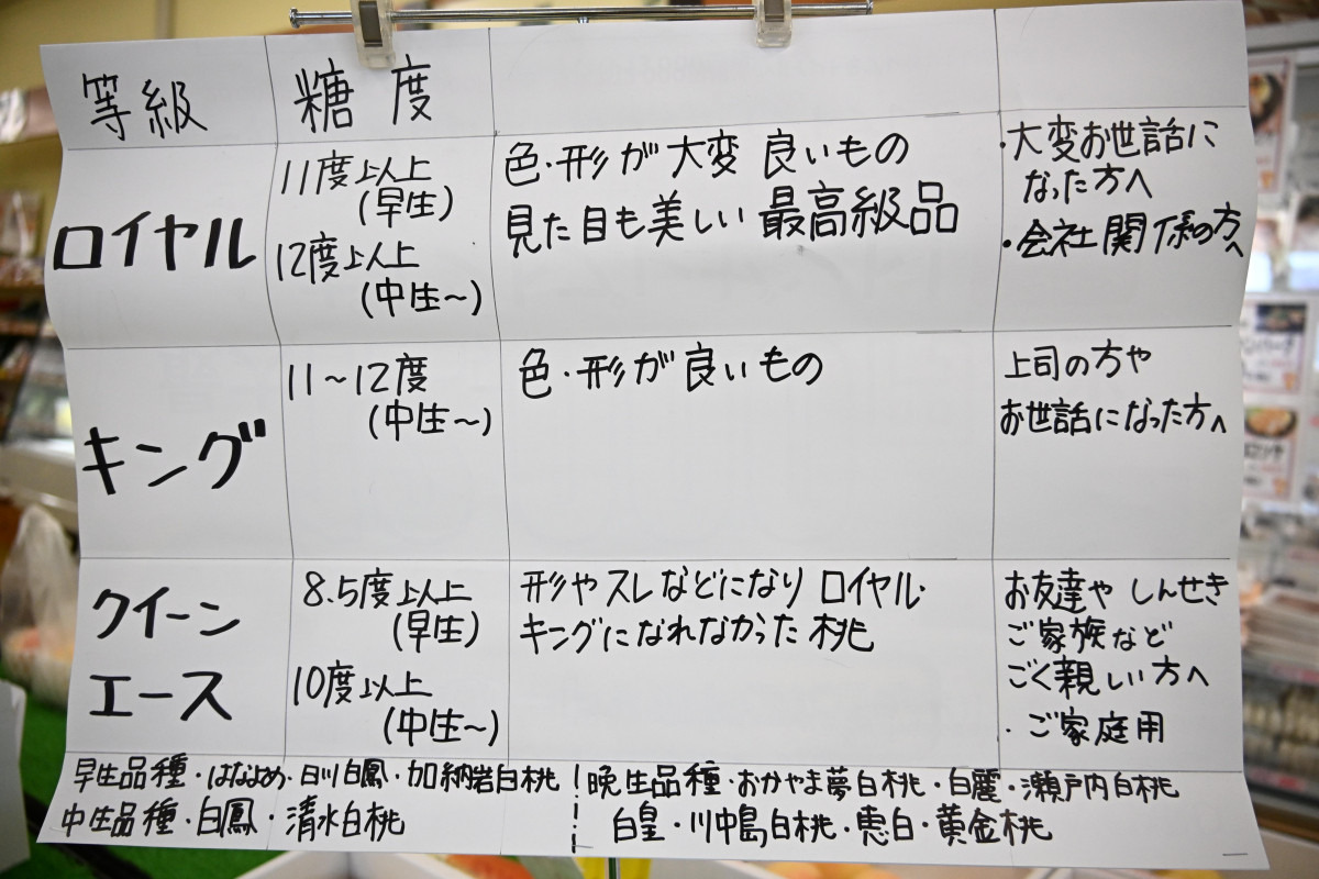 こちらで桃を購入する際にチェックしたいのが、上の写真にある等級や糖度、収穫時期などが書かれた表。会社関係の方や家族、友達などにプレゼントで買うときの参考にもなります。