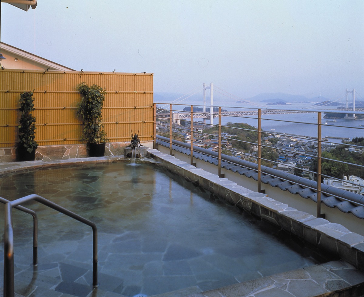 鷲羽山の高台に建つ『鷲羽ハイランドホテル』。その別館屋上階にある露天風呂から見渡せるのは、瀬戸大橋も望める備讃瀬戸の大パノラマ! 海抜110mからの眺望とともに天然温泉を堪能できます。