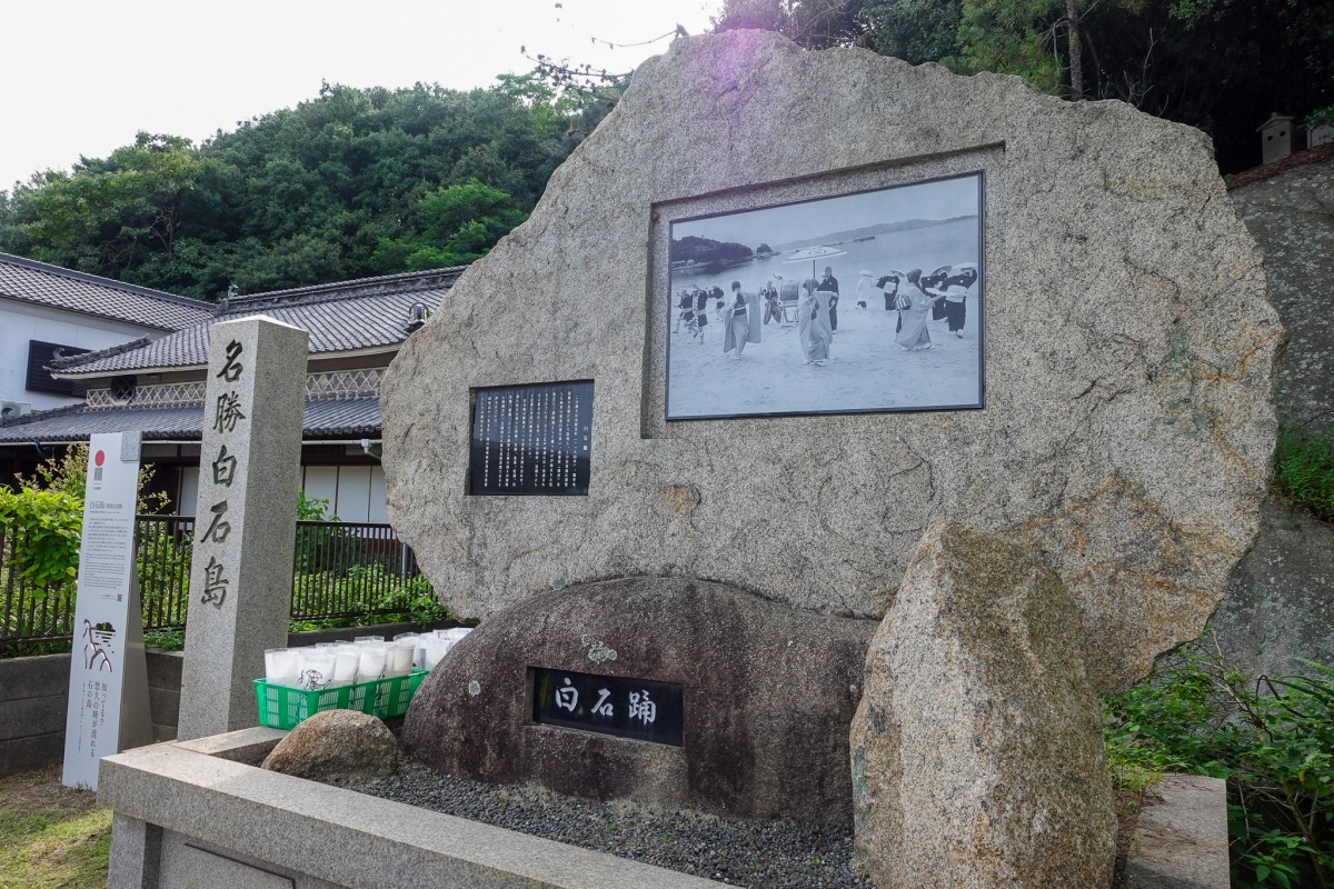 名勝白石島と書かれた石碑は昭和初期のもの。