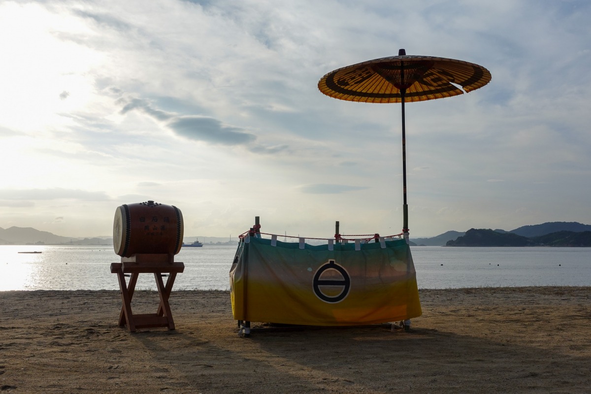 夕暮れの砂浜に、太鼓と傘が用意されました。