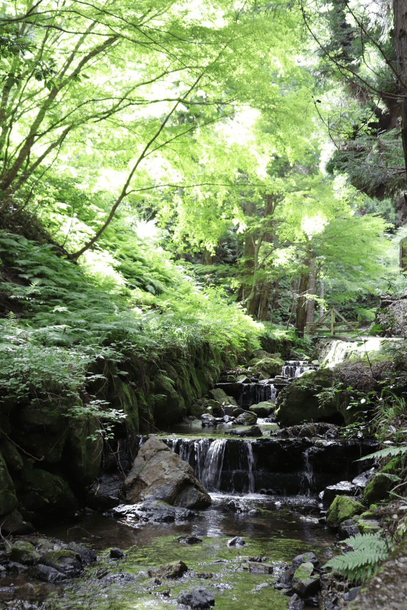 グリーンのモミジに囲まれた木陰で、流れてくるそうめんを引き上げながら、初めての流しそうめん体験。食後は、少し上流にある横野滝の二の滝に行きました。マイナスイオンとともに、ひんやりとした空気が沢を伝って流れていて、別世界のようでした。