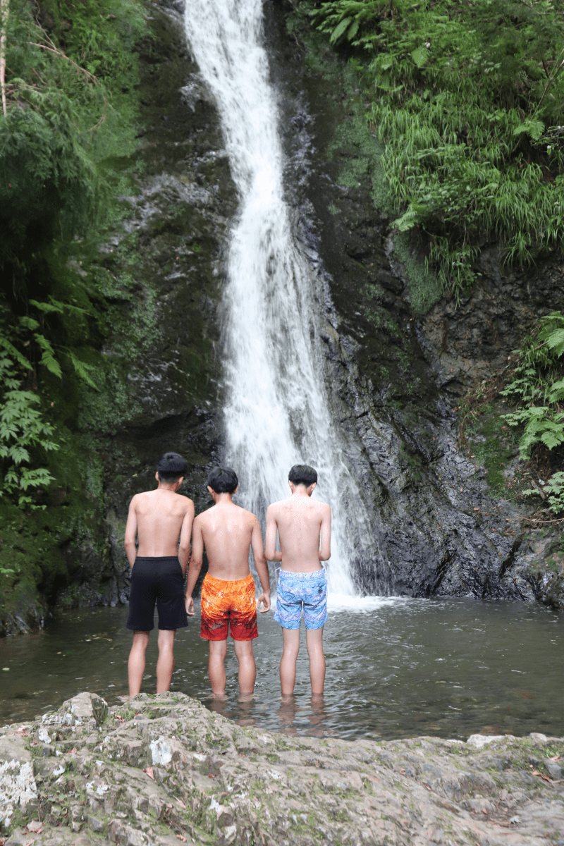 私たちの後ろの席で流しそうめんを食べていた、爽やかで礼儀正しい高校生3人組が先に二の滝に到着していました。準備万端、服を脱いで勢いよく水の中に入りましたが、涼しい森の中で、冷たい山の水が流れてくる滝なので、ブルブルしていました。