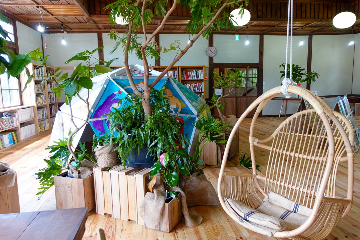 中央には子ども向けの木のテーブルや椅子、ハンギングチェアがあり、揺られながら本を読む子どもも。