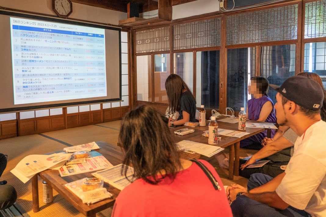 リアルでの顔合わせは初の人も多く、まずは簡単な自己紹介。ちょっと和んだところで午前の部スタートです。最初に編集部から、直近のおか旅記事のランキングやどんな地域の人から見られているかなどの発表を行いました。