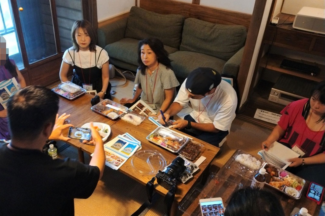 食べる前に撮影実践! テーブルに並んだお弁当を被写体に、角度や余白の取り方、光の入れ方などを考えながら、より魅力的に見える写真を目指して各自撮影。