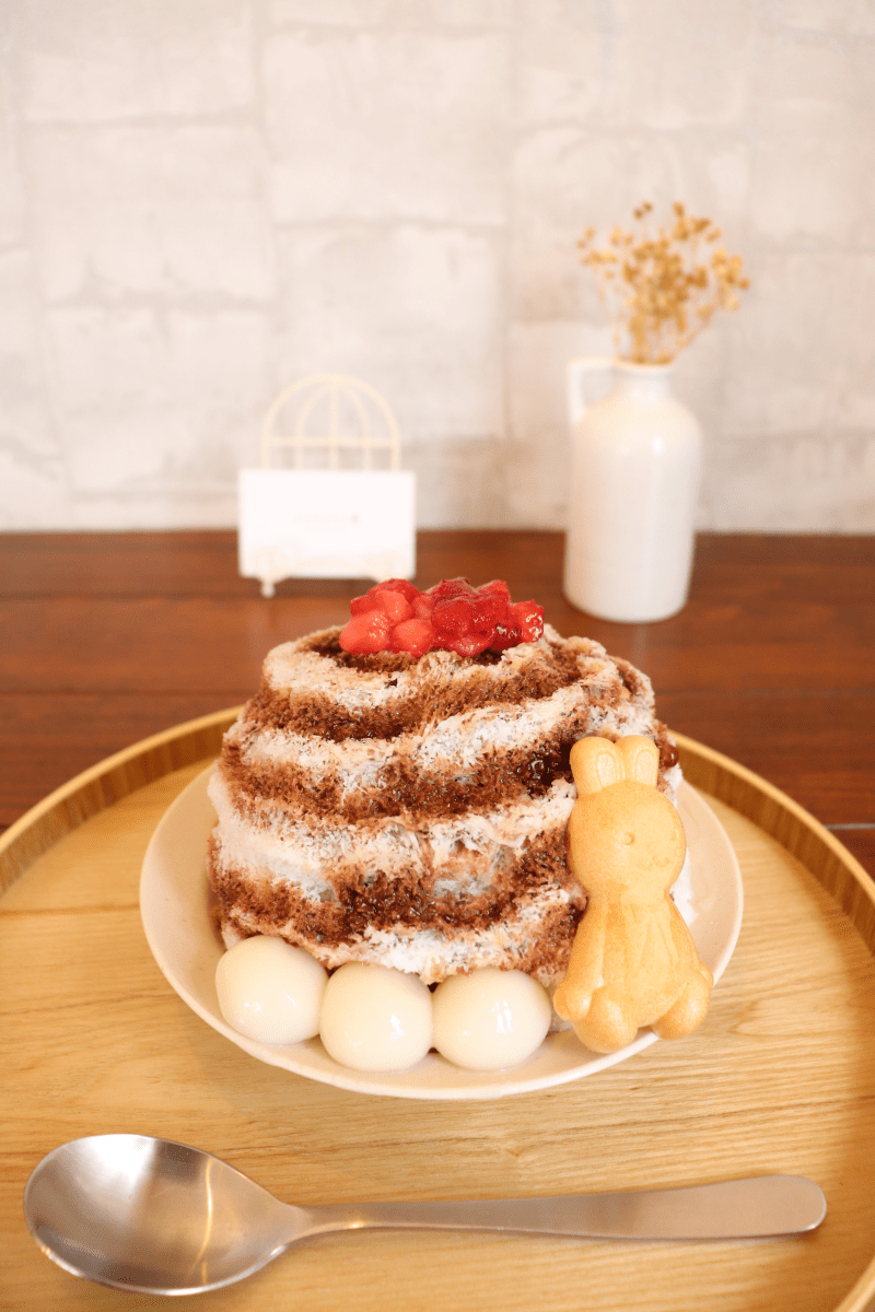 バリエーションのあるメニューなので迷いましたが、ウサギと白玉に惹かれて、「ウサギと苺ショコラ」にしました。ウサギの中は空なので、まずはかき氷を入れて、かき氷最中風に頂いてみました。シロップが渦巻きに丁寧にデコレーションされていて、丁寧に作られたかき氷の印象を受けました。イチゴとショコラの相性はバッチリなので、白玉と一緒に和のスイーツ感覚で頂きました。美味しかったです!