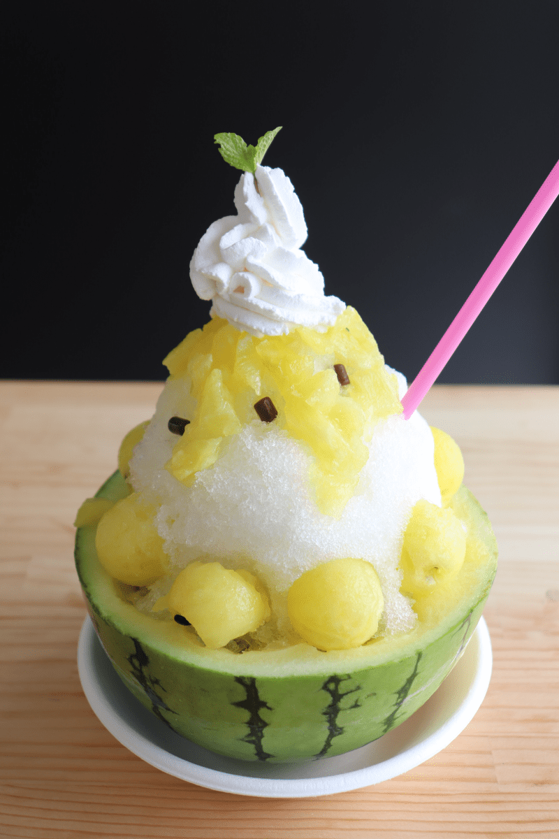 どれも美味しそうで迷いましたが、「丸ごとスイカのかき氷」にしました‼フルーツは旬のものを使うので、その日の仕入れ状況によって変わるそうですが、この日のスイカは黄色スイカでした。かき氷の表面にはチョコチップがのっていて、違う食感でアクセントになっていました。くり抜かれた丸いボールのようなスイカは、甘くてさっぱりしていました。生クリームと共にあっという間に食べてしまいました 笑。
