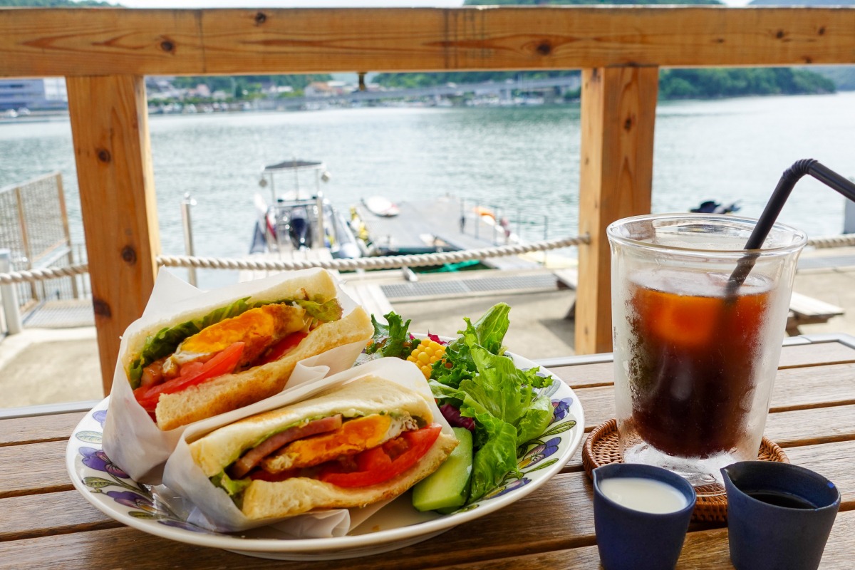 海が見えるウッドデッキで、BLTのサンドイッチとコーヒーを潮風を感じながらいただきました。