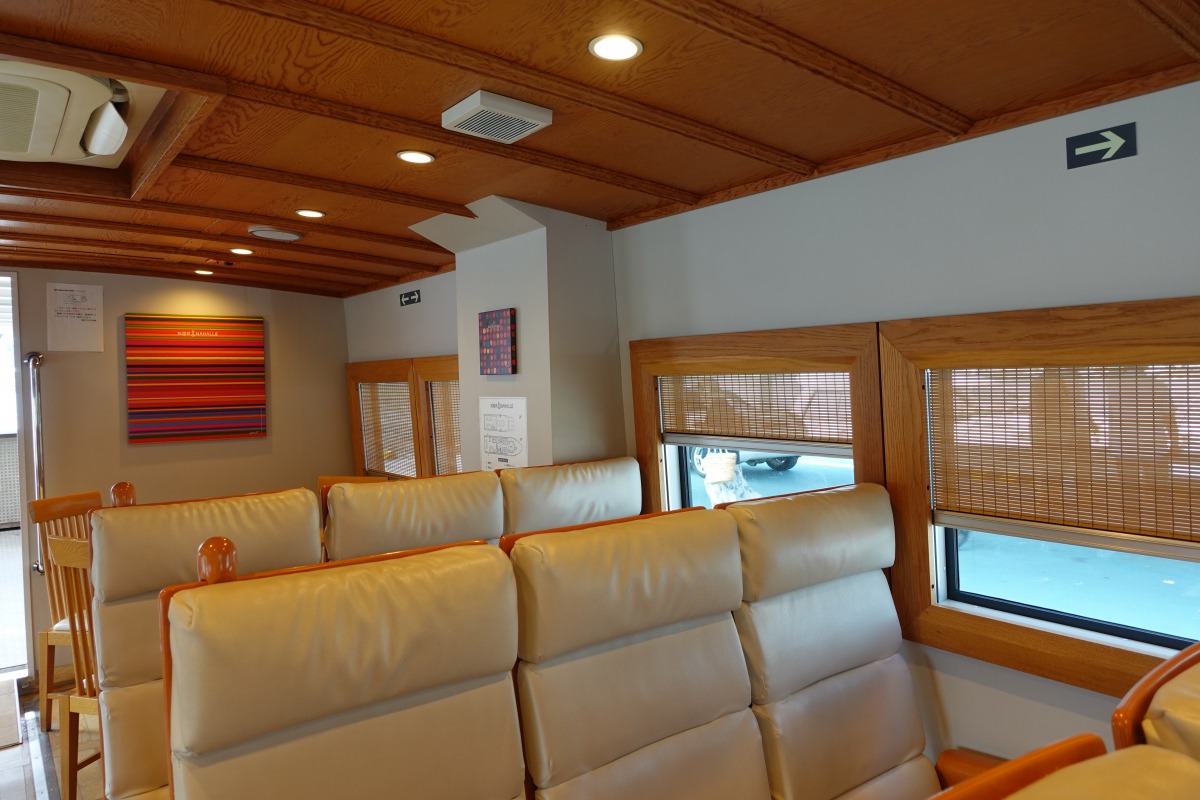 木目の内装に革張りの椅子で、まるで個人のクルーザーのような高級感がたっぷりです。クルーズ料金1,000円とは驚きですね。