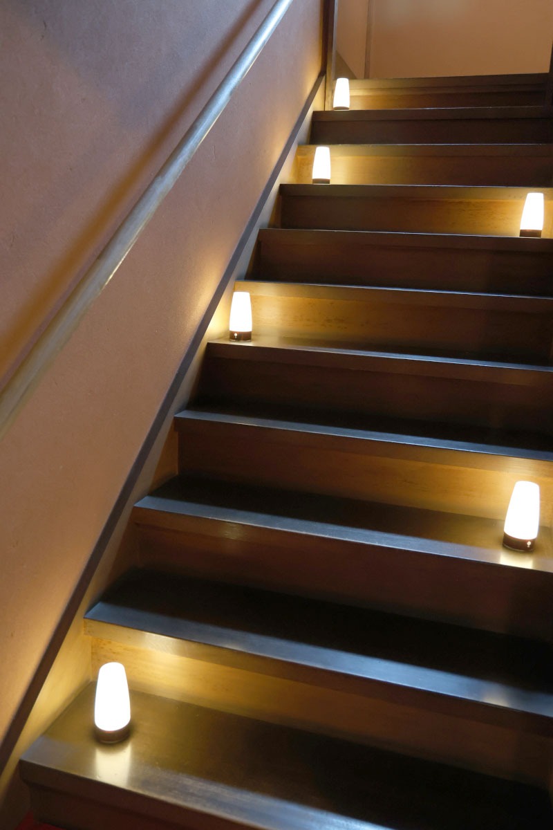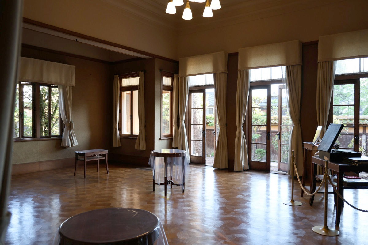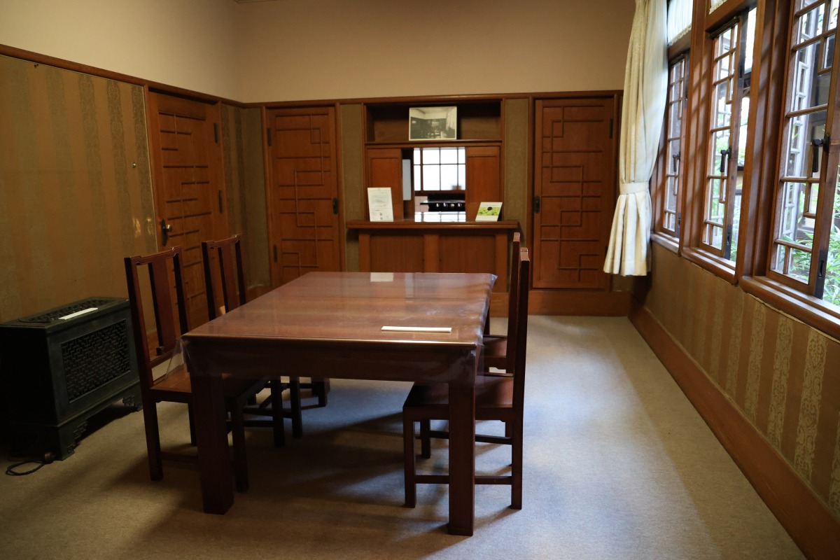 実業家の大原孫三郎は、奨学金制度で人を育てることもしていて、そのうちの一人、薬師寺主計(やくしじかずえ)は、ヨーロッパで近代建築を学び、有隣荘を設計しました。アールデコを感じるデザインが随所に見られます。ウェルカムドリンクは、この洋間でのみ頂けます。