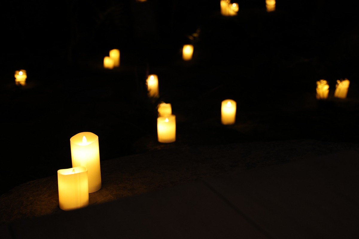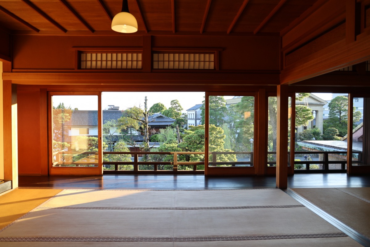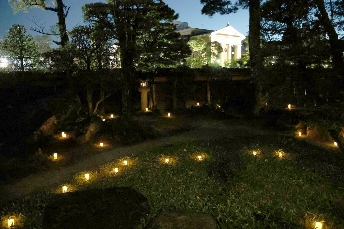 1階の和室からは、日が沈むにつれて浮かび上がってくる庭園のキャンドルの灯りが幻想的できれいです。和室の柱は台湾檜、天井は屋久杉で、今や手に入らない貴重なものとなっています。