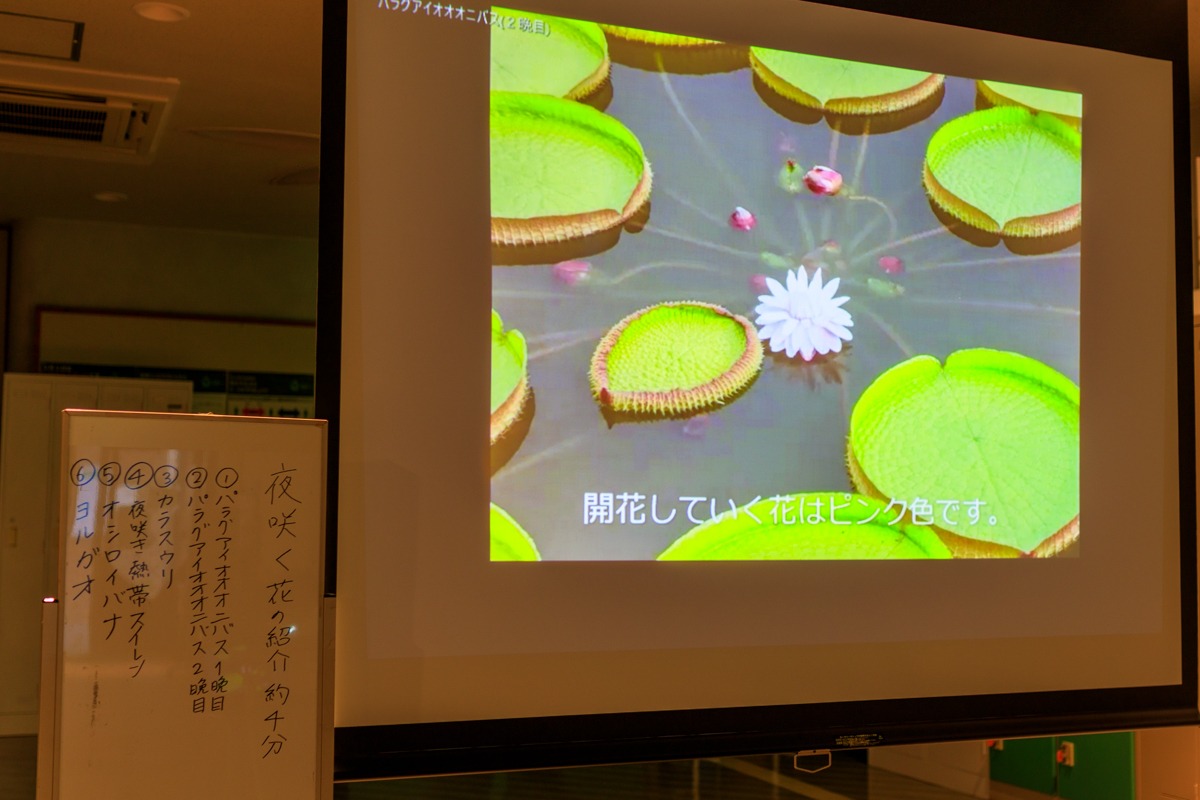 正面 ゲート右側にある植植物園会館では、夜に咲く花の動画が上映されています。